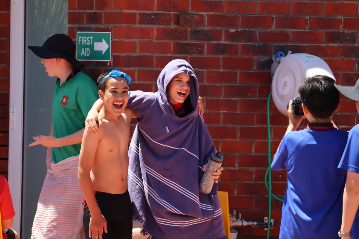 A dip in the College pool was welcome relief for the whole Middle School on what was a scorching summer afternoon. The carnival catered for all levels and motivations – quality individual swims for those targeting competitive endeavours, two divisions/distance relays for House success and WAR games which maximised participation. Our final novelty event of the day saw an initially confident group of Year 9 boys take on the staff ‘dream team’ including; Mr Matkovich, Mr O’Neill, Mr Justin Morisey, Mr Kristian Morisey, Mr Dempsey and Mr James Valentine. Class and experience shone through with the teachers finishing 30 metres ahead at the wall!