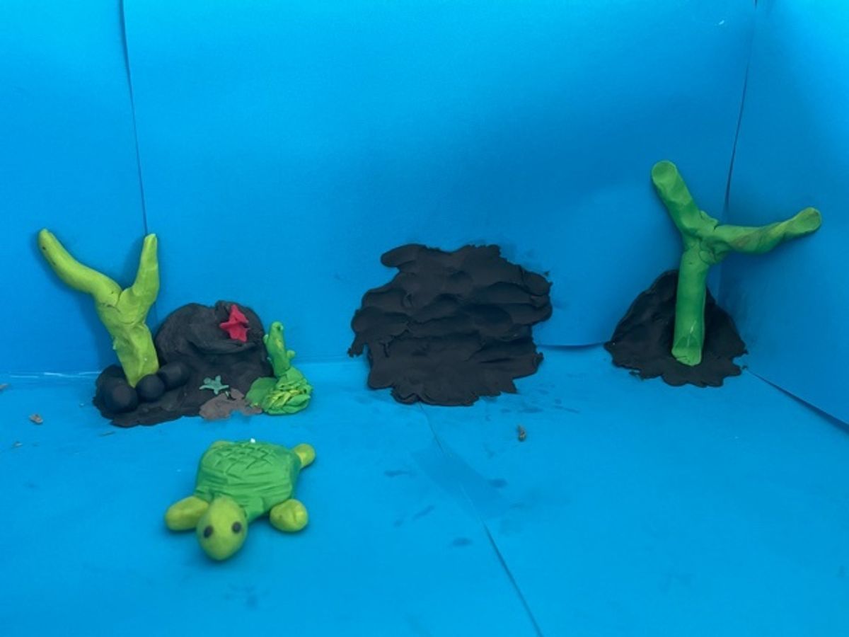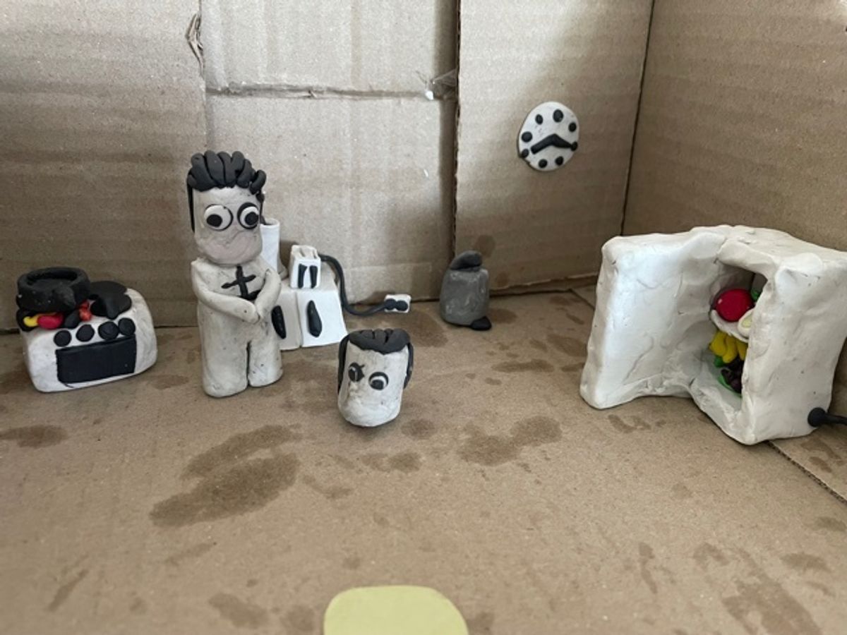 The boys are collaborating to make figurines, props and settings for their projects.